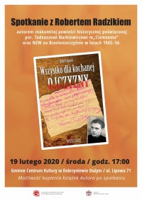 Gminne Centrum Kultury w Dobrzyniewie Dużym serdecznie zaprasza na spotkanie z Robertem Radzikiem - znakomitym pisarzem, publicystą oraz pasjonatem historii. Podczas spotkania autor zarysuje ramy tematyczne tzw. "wyzwolenia" Polski przez Sowietów i sposób, w jaki były ustanawiane rządy komunistów oraz ukaże kulisy dramatycznej walki podziemia niepodległościowego na Białostocczyźnie. 19 lutego...