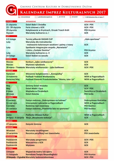 Zachęcamy wszystkich mieszkańców gminy Dobrzyniewo Duże do zapoznania się z tegorocznym kalendarzem imprez kulturalnych. Planując wydarzenia na 2017 rok dołożyliśmy wszelkich starań, by nasza oferta spełniła państwa oczekiwania. Serdecznie zapraszamy do uczestnictwa w planowanych przez nas inicjatywach.