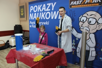 Trzeci dzień ferii był dniem pełnym wrażeń. W Gminnym Centrum Kultury w Dobrzyniewie Dużym został przeprowadzony pokaz fizyczny, podczas którego dzieci uważnie obserwowały eksperymenty z ciekłym azotem. Po zakończonym pokazie odbył się test wiedzy z nagrodami. Następnie dzieci uczestniczyły w różnych zabawach ruchowych przy muzyce i konkursach z nagrodami.