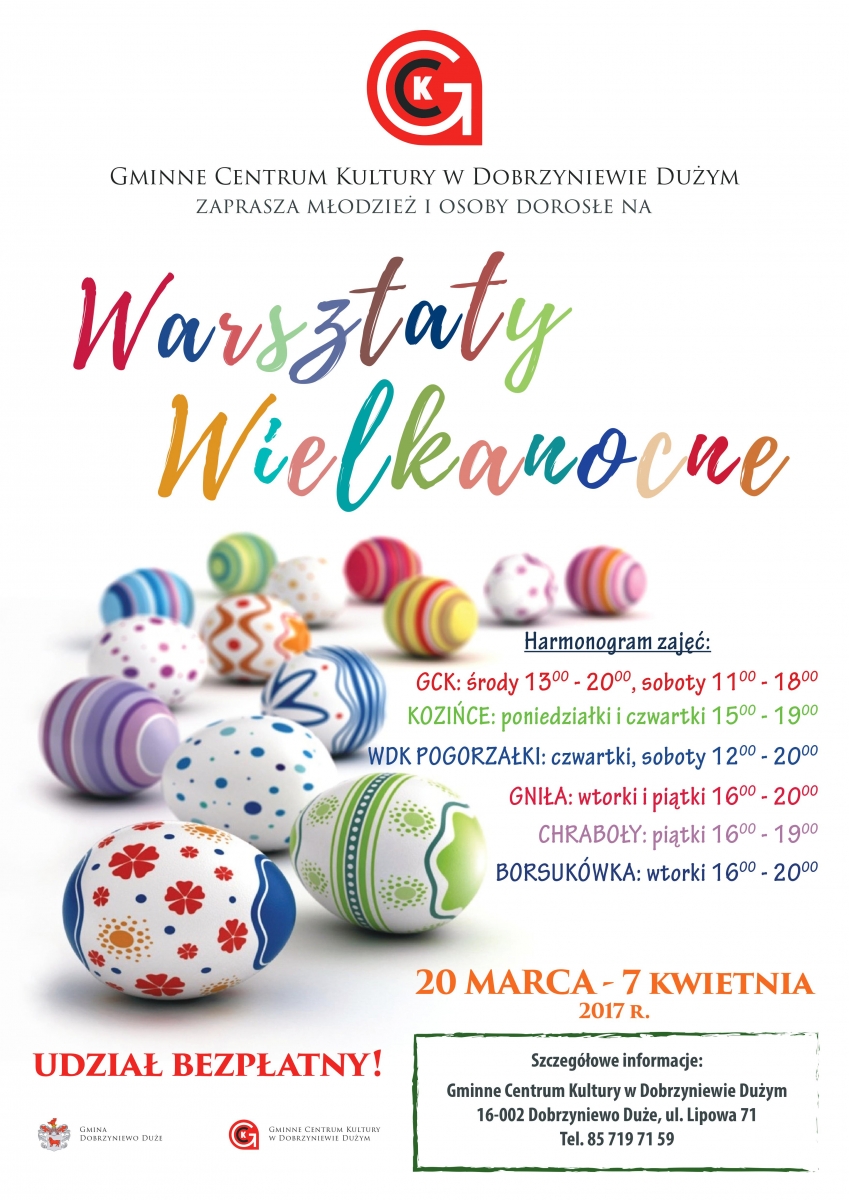Serdecznie zapraszamy wszystkich mieszkańców gminy na bezpłatne warsztaty wielkanocne. W tym roku zachęcamy do wykonania tradycyjnych jajek techniką batikową oraz palm wielkanocnych.
