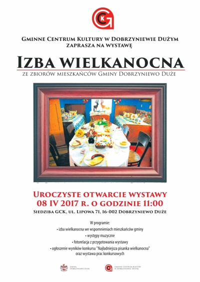 Gminne Centrum Kultury w Dobrzyniewie Dużym zaprasza wszystkich mieszkańców uroczyste otwarcie wystawy "Izba wielkanocna" ze zbiorów mieszkańców Gminy Dobrzyniewo Duże. Wydarzenie rozpocznie się 8 kwietnia 2017 roku o godzinie 11:00 w siedzibie GCK (ul. Lipowa 71, 16-002 Dobrzyniewo Duże).