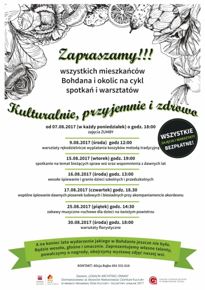Serdecznie zapraszamy do uczestnictwa w pierwszej inicjatywie lokalnej pn. "Kulturalnie, przyjemnie i zdrowo" realizowanej w ramach zadania "Lokalni architekci zmian", które Gminne Centrum Kultury w Dobrzyniewie Dużym realizuje dzięki wsparciu finansowemu i merytorycznemu Narodowego Centrum Kultury w ramach programu "Dom Kultury + Inicjatywy Lokalne 2017".