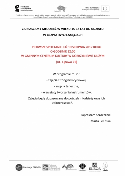 Zapraszamy młodzież z terenu naszej gminy do udziału w projekcie pt.: „Razem możemy więcej - lokalny program wsparcia rodzin”, który jest współfinansowany ze środków Europejskiego Funduszu Społecznego w ramach Regionalnego Programu Operacyjnego Województwa Podlaskiego na lata 2014-2020.