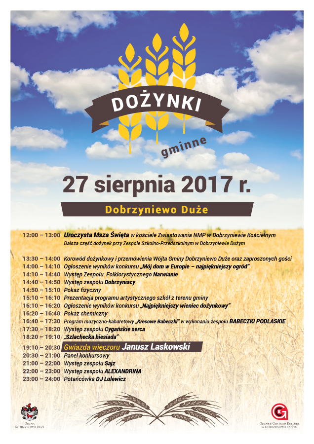 Serdecznie zapraszamy do udziału w Dożynkach Gminnych 2017 !!! Prosimy o zapoznanie się z regulaminem wydarzenia (dostępny do pobrania w załączniku).