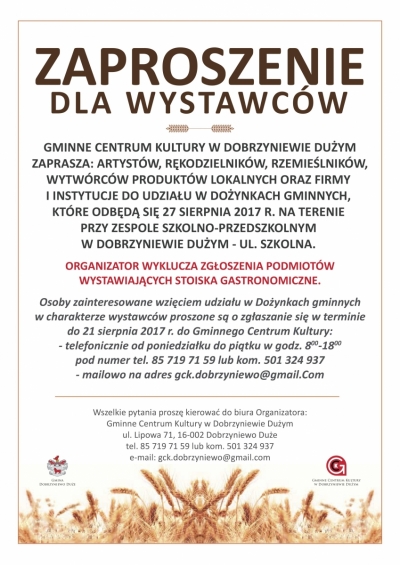 Zapraszamy wystawców do udziału w Dożynkach Gminnych 2017, które odbędą się 27 sierpnia 2017 roku w Dobrzyniewie Dużym.
