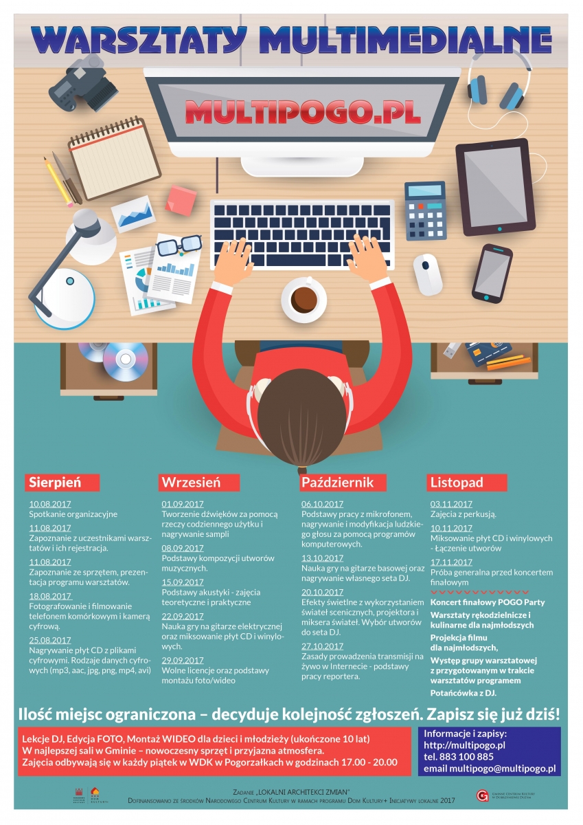 Serdecznie zapraszamy dzieci i młodzież do udziału w bezpłatnych warsztatach multimedialnych realizowanych w ramach zadania "Lokalni architekci zmian", finansowanych przez Narodowego Centrum Kultury w ramach programu "Dom Kultury + Inicjatywy Lokalne 2017".