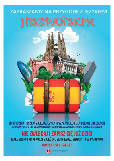 Od stycznia 2018 roku poszerzamy naszą ofertę o naukę języka hiszpańskiego. Zajęcia będą odbywały się w poniedziałki w godzinach popołudniowych. Zachęcamy wszystkich mieszkańców gminy do uczestnictwa w zajęciach.