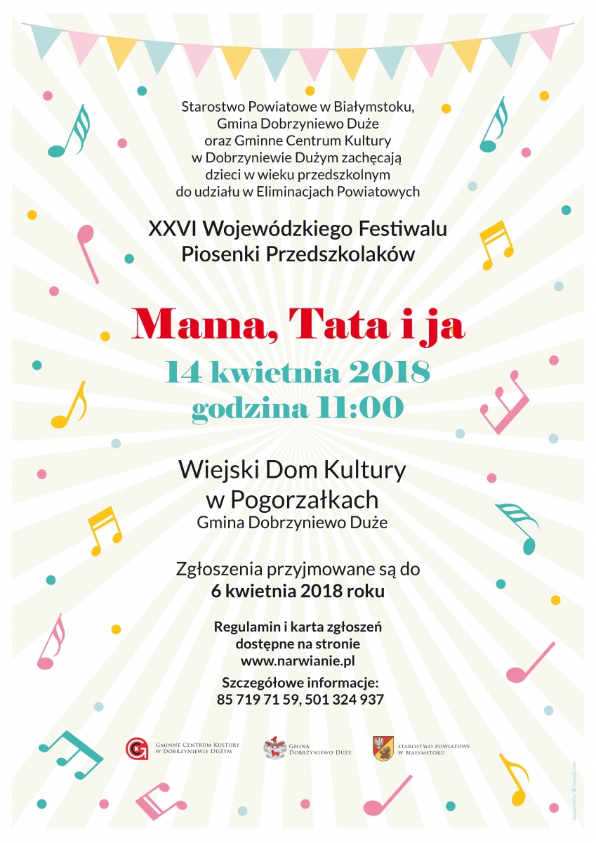 Zapraszamy wszystkie dzieci w wieku przedszkolnym uczęszczające do przedszkoli na terenie Powiatu Białostockiego do udziału w eliminacjach powiatowych XXVI Edycji Wojewódzkiego Festiwalu Piosenki Przedszkolaków „Mama, tata i ja”. Festiwal odbędzie się w dniu 14 kwietnia 2018 roku w Wiejskim Domu Kultury w Pogorzałkach o godz. 11.00. Regulamin i karta zgłoszenia zamieszczone są poniżej.