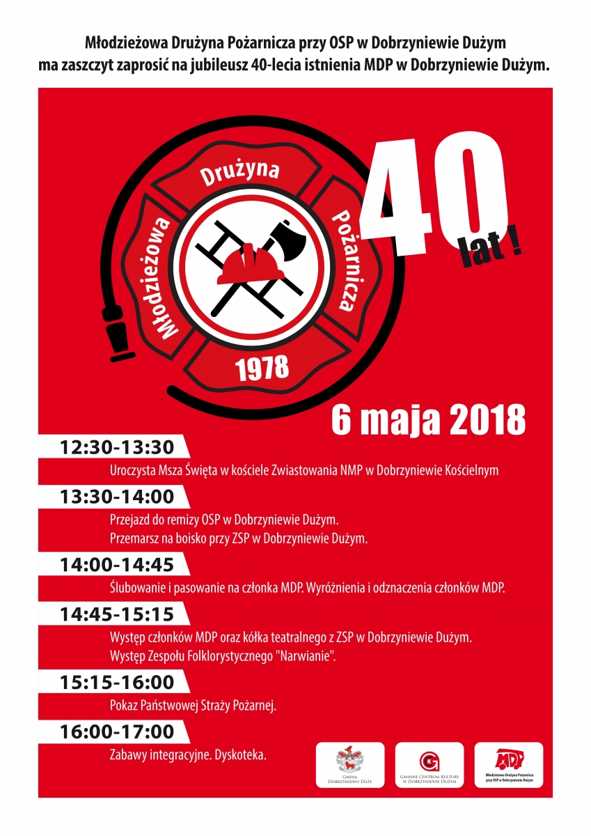 Serdecznie zapraszamy mieszkańców Gminy Dobrzyniewo Duże na uroczystość 40-lecia istnienia Młodzieżowej Drużyny Pożarniczej