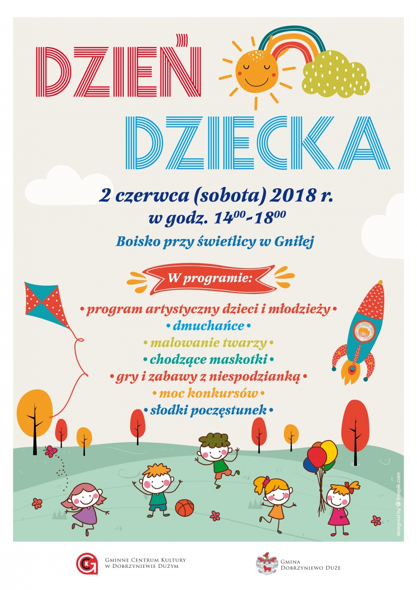 Serdecznie zapraszamy wszystkie dzieci "małe i duże" na świętowanie Dnia Dziecka. Zabawa odbędzie się 2 czerwca 2018 roku w godzinach 14:00-18:00 na boisku przy świetlicy w Gniłej.