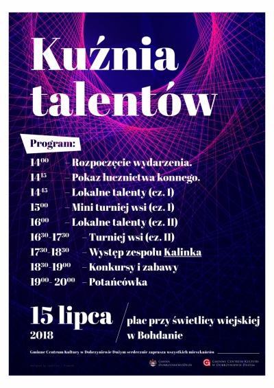 Serdecznie zapraszamy wszystkich mieszkańców gminy na wydarzenie pn. "Kuźnia talentów" połączone z I Mini Turniejem Wsi. Przedmiotowa impreza odbędzie się 15 lipca 2018 roku we wsi Bohdan.