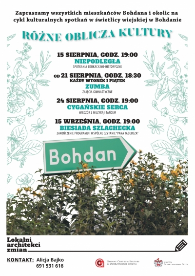 Z przyjemnością informujemy, że rusza kolejna inicjatywa lokalna. Tym razem zapraszamy na cykl imprez pt. "Różne oblicza kultury", które odbędą się w miejscowości Bohdan. Najbliższe wydarzenie, czyli spotkanie edukacyjno-historyczne pn. "Niepodległa" odbędzie się w świetlicy wiejskiej w Bohdanie 15 sieprnia o godz. 19:00. Warto tam być w ten letni wieczór. Zapraszamy!