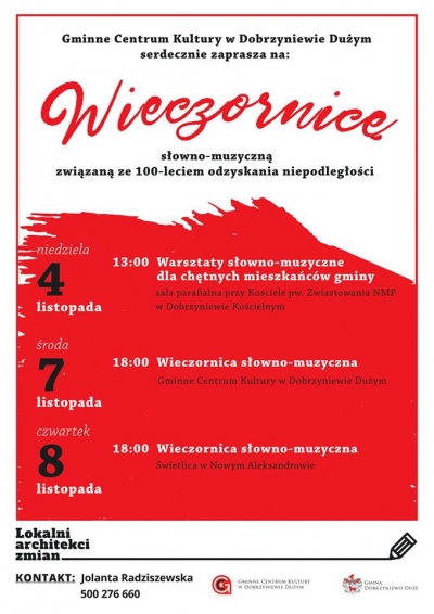 Przed nami ostatnie wydarzenie organizowane w ramach programu "Lokalni architekci zmian". Serdecznie zapraszamy na wieczornice słowno-muzyczne związane ze 100-leciem odzyskania niepodległości.