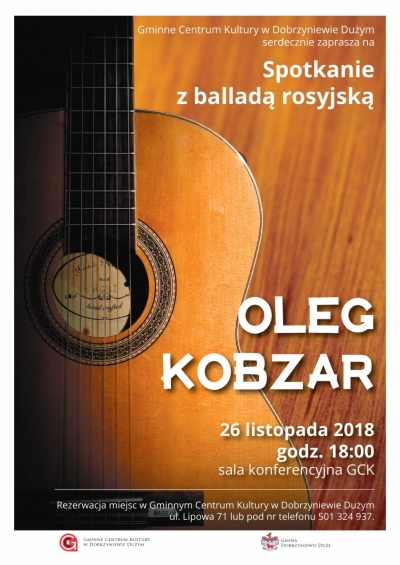 Gminne Centrum Kultury w Dobrzyniewie Dużym serdecznie zaprasza na "Spotkanie z balladą rosyjską", które odbędzie się 26 listopada o godz. 18:00 w sali konferencyjnej GCK. Koncert organizowany jest w ramach cyklu imprez muzycznych pn. "Spotkania z muzyką", które w ubiegłym roku cieszyły się uznaniem publiczności. Liczymy na Państwa obecność również teraz. Rezerwacja miejsc w siedzibie GCK lub pod nr telefonu 501 324 937.