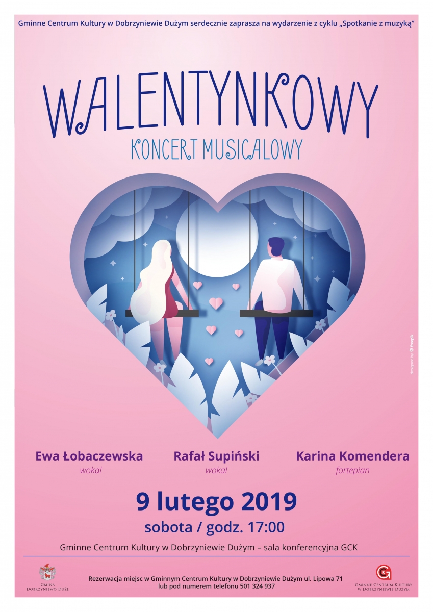Gminne Centrum Kultury w Dobrzyniewie Dużym serdecznie zaprasza na Walentynkowy Koncert Musicalowy, który odbędzie się w GCK dn. 9 lutego o godz. 17:00. Rezerwacja miejsc w siedzibie GCK lub pod numerem telefonu 501 324 937.