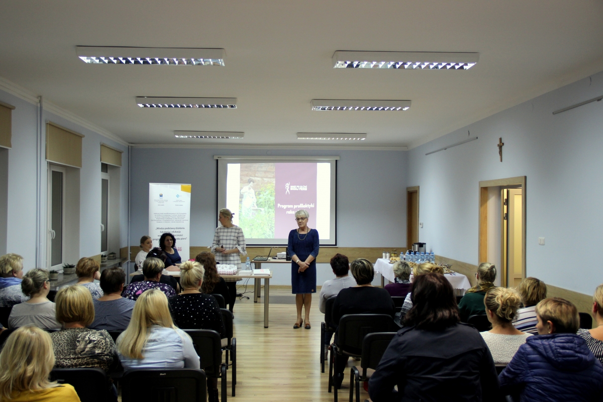 „Masz po co żyć, badaj piersi” pod takim hasłem spotkały się dnia 28 października członkinie klubu „Pełnia życia” i niezrzeszone mieszkanki naszej gminy z przedstawicielkami Białostockiego Centrum Onkologii im. M. Skłodowskiej-Curie. Samobadanie piersi to bardzo ważny element profilaktyki raka piersi. Pozwala na wykrycie zmian we wczesnym etapie choroby nowotworowej, kiedy szanse na wyleczenie są największe. Panie przybyłe na spotkanie były bardzo zainteresowane pozyskaniem wiedzy dotyczącej profilaktyki. W czasie przerwy można było porozmawiać z pracownicami BCO i poczęstować się kawą oraz przepysznym ciastem upieczonym przez członkinie KGW i Klubu z Dobrzyniewa Dużego. Spotkanie zakończył recital w wykonaniu Pawła Sokołowskiego, młodego muzyka, aranżera i kompozytora.