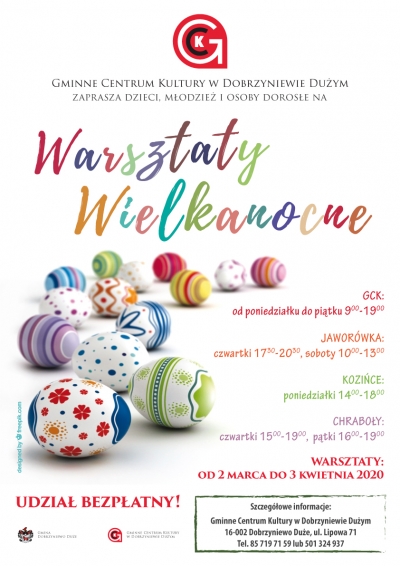 Wielkimi krokami nadchodzą warsztaty wielkanocne. Wszystkich chętnych zapraszamy do odwiedzenia naszych placówek. Więcej informacji na plakacie.