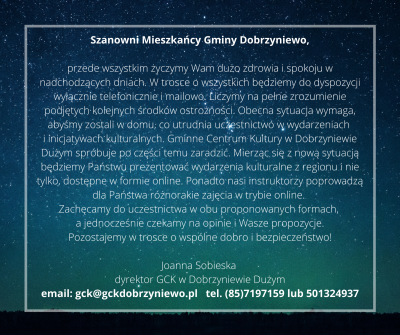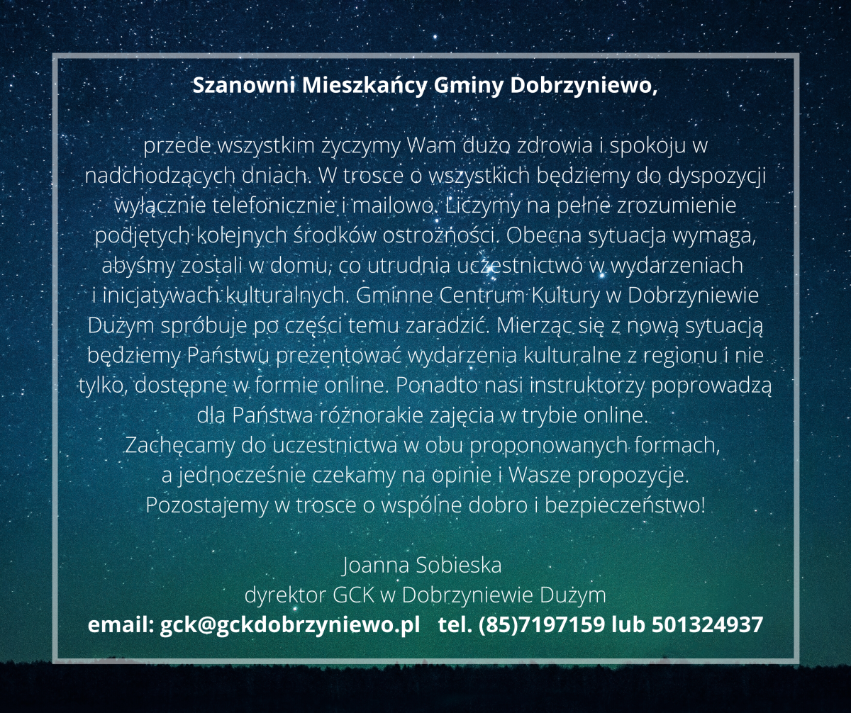 przede wszystkim życzymy Wam dużo zdrowia i spokoju w nadchodzących dniach. W trosce o wszystkich bedziemy do dyspozycji wyłącznie telefonicznie i mailowo. Liczymy na pełne zrozumienie podjętych kolejnych środków ostrożności. Obecna sytuacja wymaga, abyśmy zostali w domu, co utrudnia uczestnictwo w wydarzeniach i inicjatywach kulturalnych. Gminne Centrum Kultury w Dobrzyniewie Dużym spróbuje po części temu zaradzić. Mierząc się z nową sytuacją będziemy Państwu prezentować wydarzenia kulturalne z regionu i nie tylko, dostępne w formie online. Ponadto nasi instruktorzy poprowadzą dla Państwa różnorakie zajęcia w trybie online. Zachęcamy do uczestnictwa w obu proponowanych formach, a jednocześnie czekamy na opinie i Wasze propozycje.
