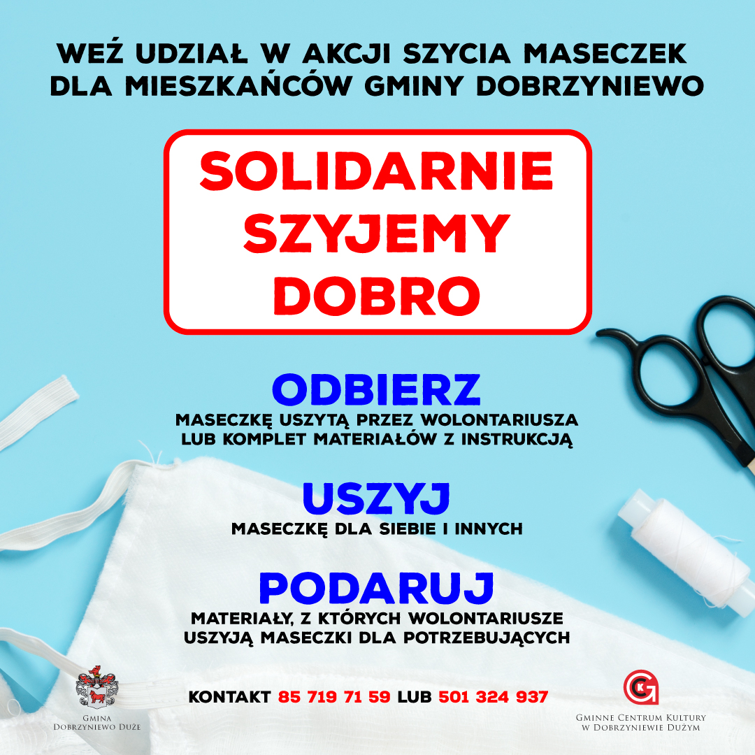 Wójt Gminy Dobrzyniewo Duże zachęca mieszkańców gminy do wzięcia udziału w akcji szycia maseczek ochronnych. Do akcji dołączyć może każdy, kto posiada maszynę do szycia i podstawowe umiejętności krawieckie. W akcję można się włączyć w następujący sposób: