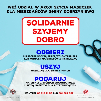 Zachęcamy także firmy z terenu gminy Dobrzyniewo Duże do wsparcia naszej akcji poprzez przekazanie materiałów niezbędnych do wykonania maseczek ochronnych. Mamy nadzieję, że powyższa akcja pomoże w obdarowaniu każdego mieszkańca gminy tym deficytowym produktem.