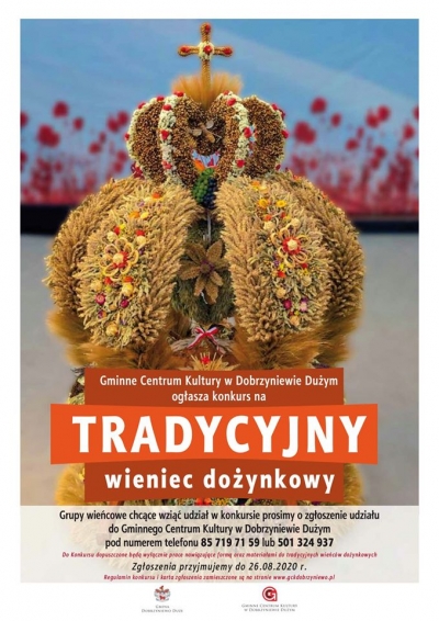 Jak co roku zapraszamy do wzięcia udziału w konkursie na tradycyjny wieniec dożynkowy. Grupy wieńcowe chcące wziąć udział w konkursie prosimy o zgłoszenie udziału do Gminnego Centrum Kultury w Dobrzyniewie Dużym pod numerem telefonu 501 324 937 do dnia 26 sierpnia.