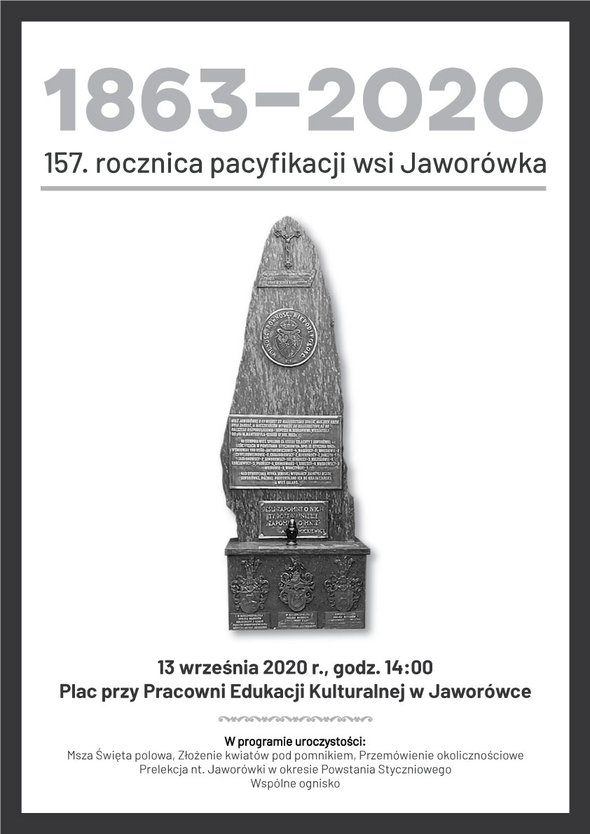 Serdecznie zapraszamy na obchody 157. rocznicy pacyfikacji wsi Jaworówka. Uroczystość rozpocznie się 13 września 2020r. o godz. 14:00 pod PEK w Jaworówce.