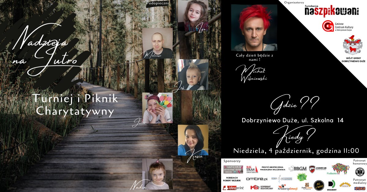 Serdecznie zapraszamy na piknik i turniej charytatywny pn. "Nadzieja na jutro" organizowany przez fundację "Naszpikowani" oraz gminę Dobrzyniewo Duże. Gościem specjalnym wydarzenia będzie Michał Wiśniewski! Do zobaczenia 4 października o godz. 11:00 przy ZSP w Dobrzyniewie Dużym. Podzielcie się sercem!