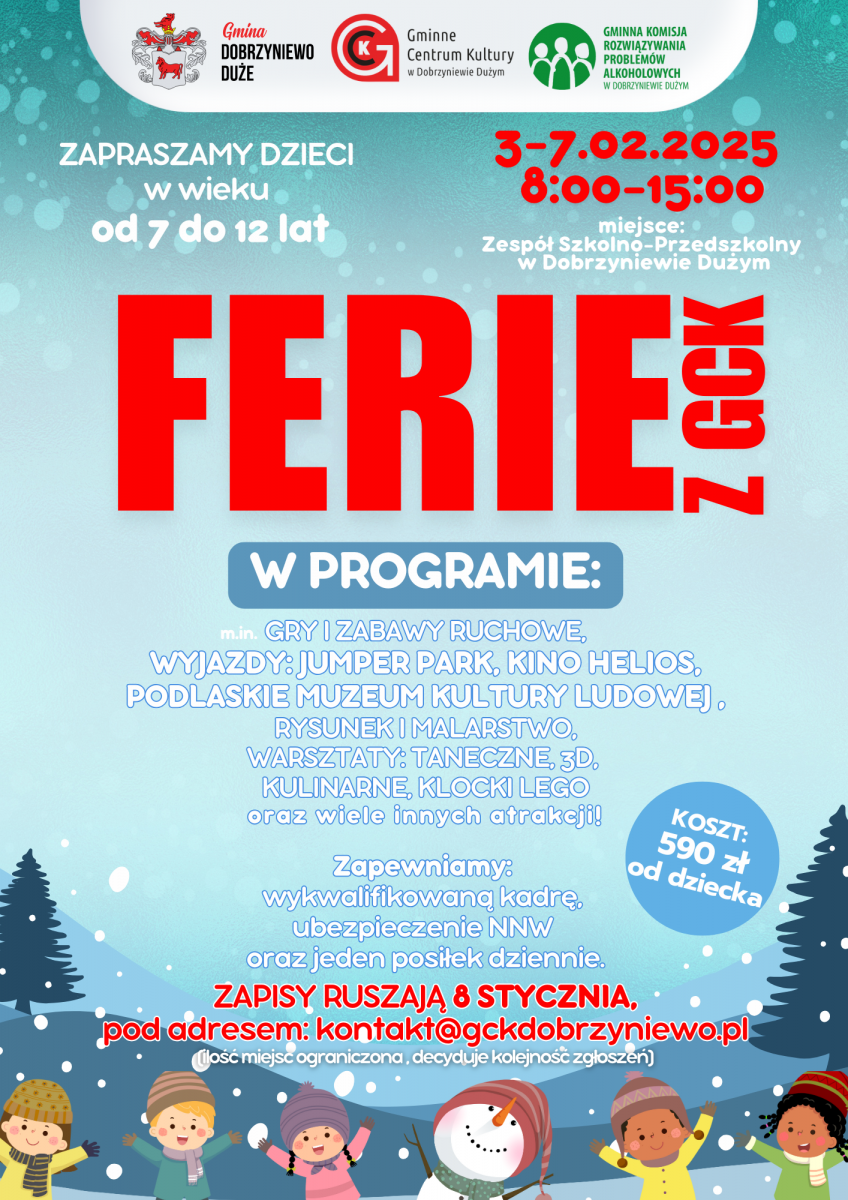 Liczba dostępnych miejsc jest ograniczona, a zapisy rozpoczynają się 8 stycznia 2025 r. pod adresem e-mail: kontakt@gckdobrzyniewo.pl. Pierwszeństwo zapisu na wypoczynek zimowy mają dzieci uczęszczające na zajęcia GCK.