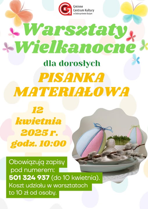 Warsztaty odbędą się 12 kwietnia o godzinie 10:00 w GCK. Zapisy przyjmowane są do 10 kwietnia pod numerem telefonu 501 324 937. Koszt udziału wynosi 10 zł.