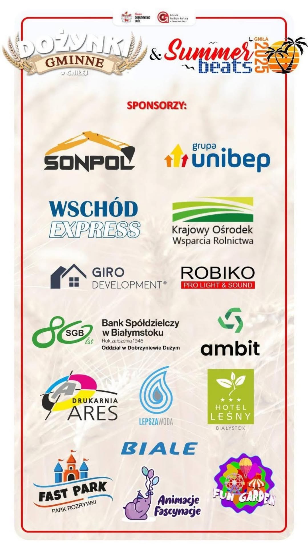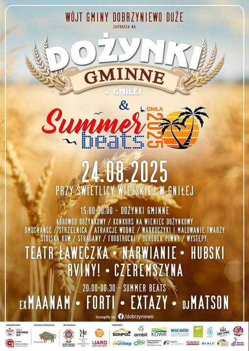 Wielkimi krokami zbliża się kolejne wielkie święto naszej gminy! Już w niedzielę, 24 sierpnia 2025 r. zapraszamy na Dożynki Gminne połączone z letnią akcją Summer Beats – wydarzenie, które tradycyjnie łączy folklor, muzykę i fantastyczną zabawę do późnych godzin nocnych.