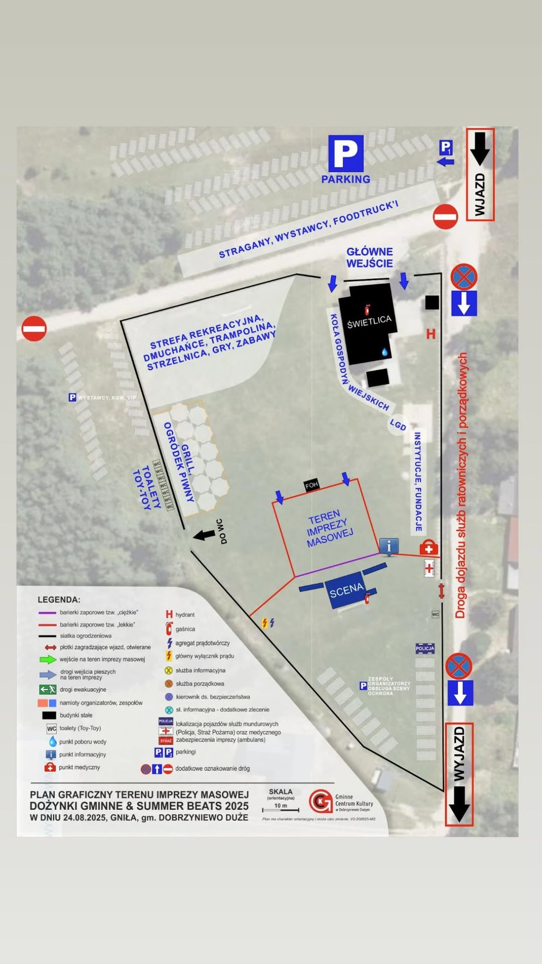 Dla wygody uczestników przygotowaliśmy też mapkę wydarzenia, która ułatwi poruszanie się po terenie i odnalezienie najważniejszych punktów. Prosimy o parkowanie tylko w wyznhaczonych miejscach, słuchanie poleceń osób kierujących ruchem i dostosowanie się do zakazu parkowania na piaskowej drodze wzdłuż boiska, poniewaśż jest to droga wyznaczona na dojazd dla służb.
