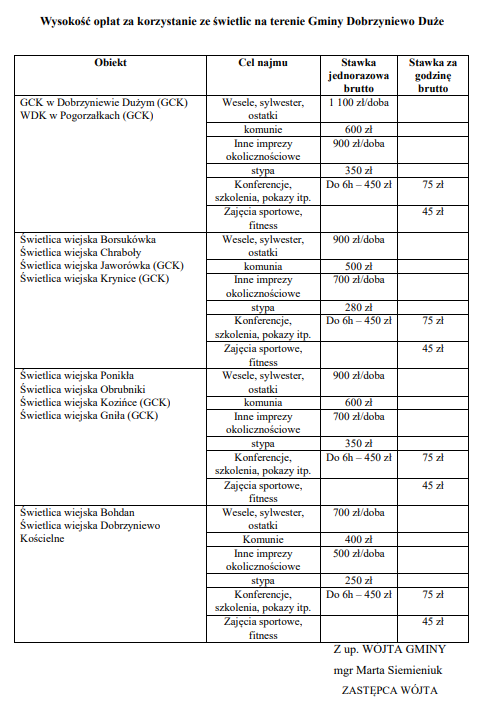 Zgodnie z Zarządzeniem nr 97/25 Wójta Gminy Dobrzyniewo Duże z dnia 25 czerwca 2025 r., wprowadzono nowy Regulamin korzystania ze świetlic wiejskich oraz zaktualizowano cennik wynajmu. Kaucja zwrotna, zabezpieczająca w przypadku organizacji wesel i imprez okolicznościowych wynosi obecnie 800 zł. Szczegóły dotyczące wynajmu dostępne są w GCK lub Urzędzie Gminy, w zależności od lokalizacji świetlicy. Administratorem świetlicy wiejskiej w Borsukówce, Bohdanie, Chrabołach,Dobrzyniewie Kościelnym, Obrubnikach i Ponikłej jest Wójt Gminy Dobrzyniewo Duże. Administratorem świetlicy wiejskiej w Dobrzyniewie Dużym, Jaworówce, Gniłej, Kozińcach, Krynicach i w Pogorzałkach jest Gminne Centrum Kultury w Dobrzyniewie Dużym.